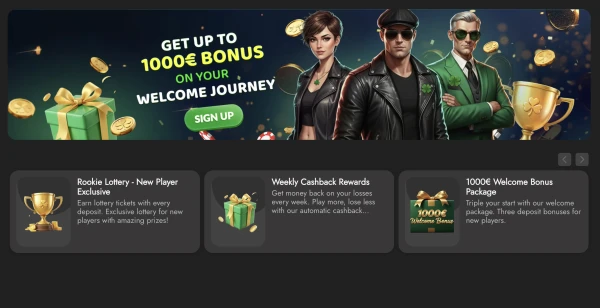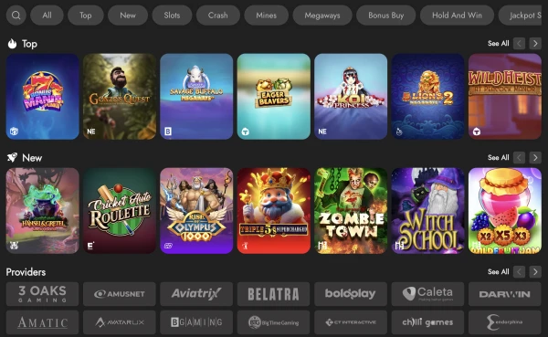 Το site προσφέρει 2.000 παιχνίδια, συμπεριλαμβανομένων slots, crash, mines, Megaways, επιτραπέζιων, jackpot slots, live casino και τίτλων λοταρίας από κορυφαίους παρόχους.