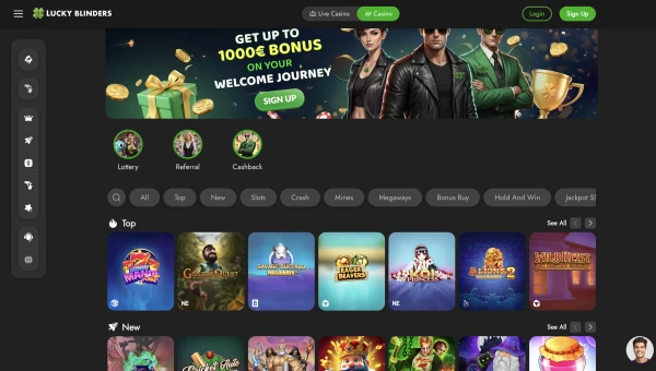Το LuckyBlinders χρησιμοποιεί μοντέρνα διάταξη με καθαρή δομή μενού και γρήγορη πρόσβαση στις βασικές κατηγορίες καζίνο. Η αρχική σελίδα παρουσιάζει τις ενότητες παιχνιδιών με λογική σειρά και η λειτουργία αναζήτησης βοηθά τους χρήστες να βρίσκουν παρόχους ή συγκεκριμένους τίτλους χωρίς πολλά κλικ. Τα οπτικά στοιχεία είναι καθαρά και ευανάγνωστα, κάτι που έχει σημασία όταν περιηγείστε σε μεγάλες βιβλιοθήκες από μικρότερες οθόνες. Σημαντικές περιοχές λογαριασμού όπως το ταμείο, το προφίλ και η επαλήθευση είναι εύκολα προσβάσιμες από το βασικό interface.